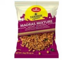 Productbeschrijving: Haldiram’s Dakshin Express Madras Mixture (180 g) brengt de smaken van Zuid-India in één zak samen. Deze kleurrijke snackmix – geïnspireerd op de beroemde “Madras mixture” – combineert allerlei knapperige elementen: van gefrituurde linzen en boondhi (kleine kikkererwtendeegbolletjes) tot cashewstukjes, pinda’s en dunne sev-staafjes, allemaal op smaak gebracht met karakteristieke Zuid-Indiase kruiden en aroma’s. Bij het openen ruik je direct de geur van kerrieblaadjes en asafoetida, die samen met een vleugje chili en kurkuma de mix zijn authentieke temperament geven. Elke hap biedt een verrassing: soms pittig, soms nootachtig, soms een rozijntje zoet (veel Madras mixtures bevatten ook een paar rozijnen voor contrast). Deze hartige mix is perfect bij een kop filterkoffie of chai, of als borrelhapje voor wie eens iets anders wil dan standaard notenmix. Dakshin Express Madras Mixture is de authentieke kruiden-beleving van Tamil Nadu – pittig, tangy en crunchy – verpakt in een handig formaat voor thuisgenot.