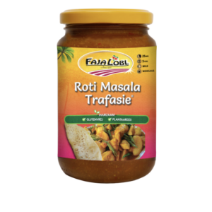 Faja Lobi Roti Masala 360 ml is a versatile Surinamese curry base with classic roti masala spices. Make a hearty dish with chicken, egg, or vegetables and serve with warm roti. A reliable roti masala sauce when time is short, but flavor is key.
