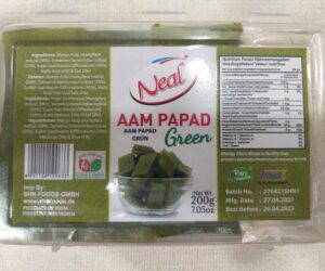 Dun, zacht fruitleer van (groene) mango met speelse zoet‑zure “khatta”‑smaak. Perfect als tussendoortje, in de lunchbox of als zoete noot op een dessertplank. Rol op, snijd in reepjes of combineer met noten voor een leuke snackmix. Aam papad kopen kan bij Mittal Supermarkt (Haarlem of online); tropische snack, het hele jaar door. (Algemene productinfo over aam papad/fruit leather.) Wikipedia