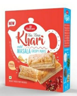 Haldiram’s Masala Khari zijn lichte, hartige bladerdeegkoekjes – perfect om te genieten bij een kop thee of koffie. Deze knapperige “puffs” bestaan uit meerdere laagjes luchtig deeg, subtiel gekruid met Indiase specerijen (masala) voor extra smaak. Bij elke hap ervaart u de boterachtige, schilferige textuur van het deeg, gevolgd door een milde, aromatische kruidigheid. Masala Khari is een geliefde snack tijdens de Indiase ’tea time’ en biedt een verslavende combinatie van crispy crunch en kruidige authenticiteit.