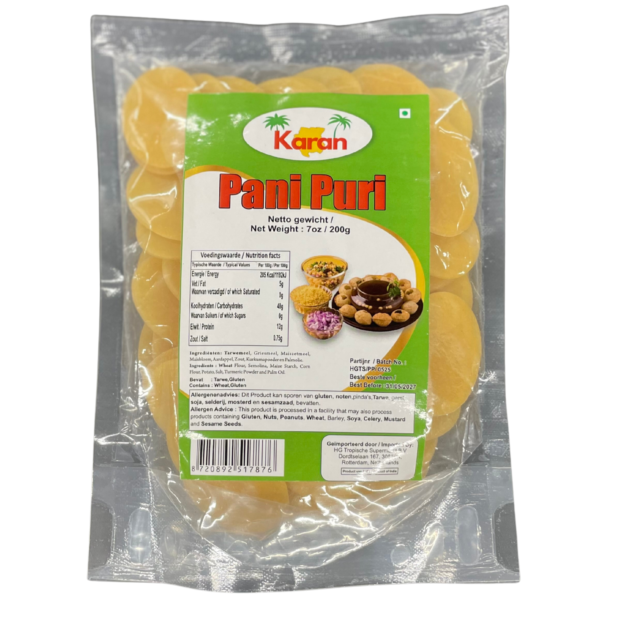 Met Karan Pani Puri 200g haal je knapperige, holle puri‑schelpen in huis voor echte street‑food beleving. Vul de puri’s met aardappel en kikkererwt, voeg zoete tamarinde‑chutney en pittige groene ‘pani’ toe, en geniet van de perfecte combinatie van crunch, zuur, zoet en spice. De puri’s hebben een luchtige bite en blijven mooi krokant wanneer je ze vlak voor het serveren vult. Ideaal voor feestjes, borrels en familiediners—iedereen bouwt zijn eigen porties. Bestel Pani Puri bij Mittal Supermarkt (Haarlem of online) wanneer je zoekt naar ‘pani puri kopen’, ‘golgappa online bestellen’ of ‘chaat ingrediënten NL’. Snelle, leuke en smaakvolle snack die altijd scoort.