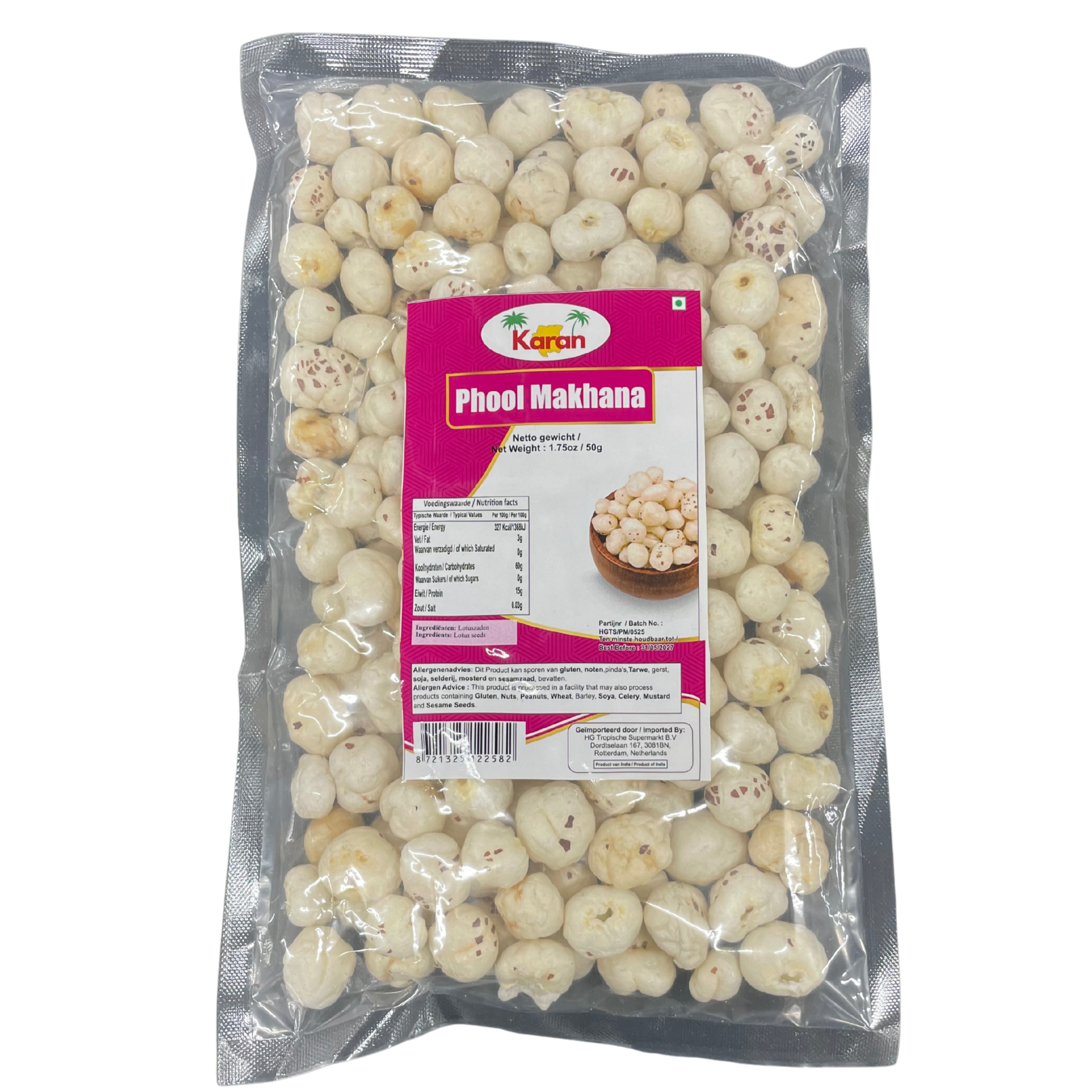 Karan Phool Makhana (foxnuts/lotuszaden) zijn lichte, holle snacks met een subtiele, nootachtige smaak. Rooster de makhana kort in ghee of olie en kruid met peper, zout of chaat masala voor een crispy, schuldvrije borrelsnack; of gebruik ze in curry’s en kheer voor extra textuur. De compacte 50 g‑verpakking is perfect om kennis te maken of om mee te nemen. Zoek je ‘makhana kopen’ of ‘lotuszaden snack online bestellen’? Bij Mittal Supermarkt (Haarlem en online) vind je frisse, droge makhana die snel krokant roosteren en lang knapperig blijven.