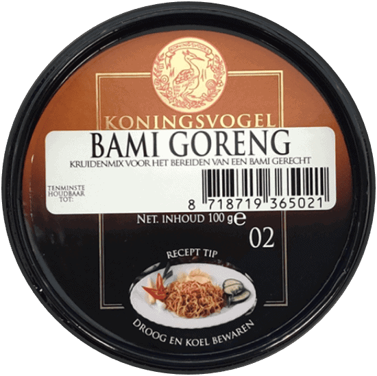 Koningsvogel Bami is een geurige kruidenmix voor authentieke bami in een handomdraai. Meng de mix met groenten, vlees of tofu en voeg noedels toe; binnen minuten staat er een smakelijke bami op tafel. De mix is uitgebalanceerd zodat je niet meer losse specerijen nodig hebt – handig voor snel koken met constante smaak.