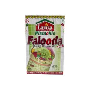 Laziza Falooda Pistache is een faloodamix met pistachesmaak voor romige, nootachtige dessertdrankjes. Meng met melk, basilicumzaadjes en vermicelli en garneer met gelei en noten. Deze **pistachefaloodamix** is een heerlijke, koele zomerfavoriet.