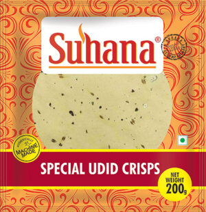 Productbeschrijving: Suhana Special Urid Papad zijn dunne, krokante lenterwtenwafels (papadums) gemaakt van urid dal (urad, zwarte linzen) en een verfijnde mix van kruiden. Deze papadums worden traditioneel geserveerd als knapperig bijgerecht bij Indiase maaltijden of als hartige snack. Suhana’s Special Urid Papad onderscheidt zich door zijn authentieke huisgemaakte smaak: elke schijf is met zorg vervaardigd, bevat natuurlijke ingrediënten en is op smaak gebracht met specerijen zoals zwarte peper en komijn voor een pittige kick. Wanneer geroosterd of gefrituurd, zwelt de papad op tot een lichte, luchtige cracker die je smaakpapillen trakteert op authentieke Indiase aroma’s. Dit product is glutenvrij (gemaakt van linzenmeel), rijk aan plantaardige eiwitten en vezels uit de linzen, en bevat geen kunstmatige toevoegingen. Een heerlijke en verantwoorde crunch om van te genieten!
